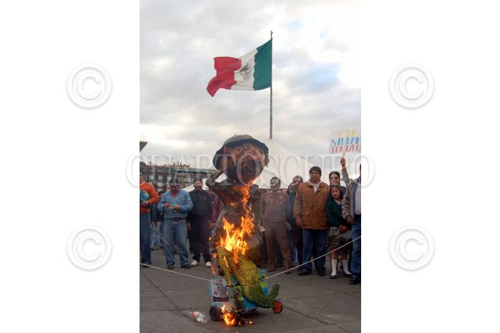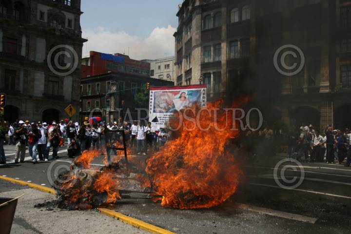 MÉXICO, D.F.. 01MAYO2008.-Con una marcha por la mañana integrantes de diversos sindicatos independientes celebraron el Día Internacional del Trabajo, en la plancha del Zócalo capitalino.En la imagen, queman figuras de cartón con la imagen de Juan Camilo Mouriño, secretario de gobernación. FOTO: GUILLERMO PEREA /CUARTOSCURO.COM