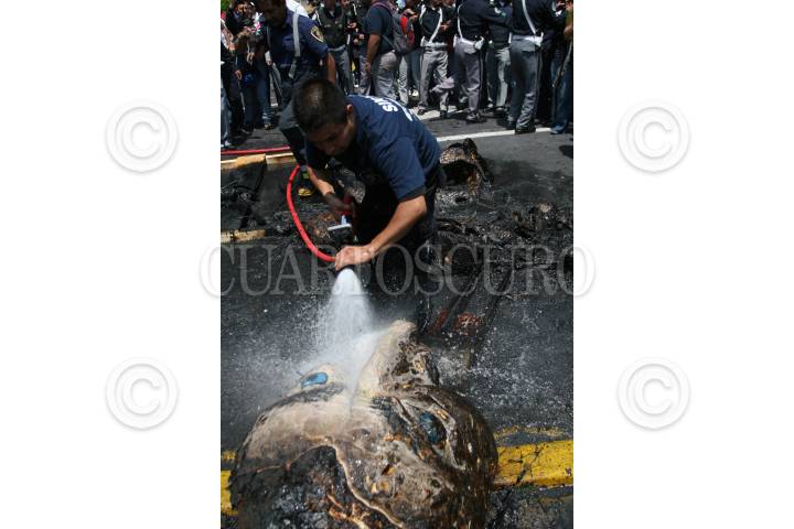 MÉXICO,D,F.,29 OCTUBRE2007.- Integrantes del sindicato de trabajadores de la UNAM (STUNAM), queman una figura del presidente Felipe Calderon para manifestar su inconformidad a la reforma de la nueva ley del ISSSTE. FOTO: ADRIANA ALVAREZ ESPINOSA/CUARTOSCURO.COM