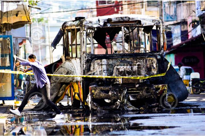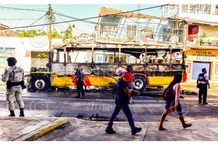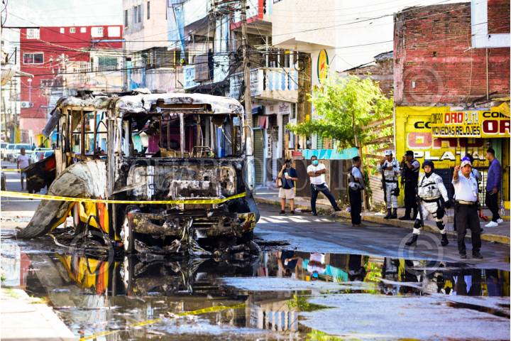 ACAPULCO, GUERRERO. 20FEBRERO2024.- Hombres armados incendiaron está mañana un camión urbano en el Centro Acapulco, el camion de la ruta Hospital Vacacional fue consumido por el fuego sobre la calle Aquiles Serdan fuera de la ruta que recorre, el lugar fue asegurado para realizar diligencias. FOTO: CARLOS CARBAJAL/CUARTOSCURO.COM