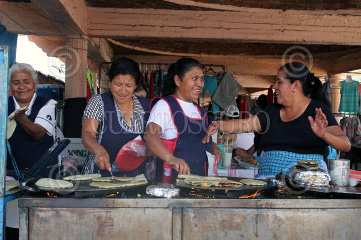 TLAYACAPAN, MORELOS, 01ABRIL2015.- Señoras de Tlayacapan preparan contentas tlacoyos, quesadillas y otros antojitos típicos en la explanada del mercado, donde turistas locales y extranjeros asisten en esta temporada vacacional. FOTO: PATRICIA MORALES / CUARTOSCURO.COM
