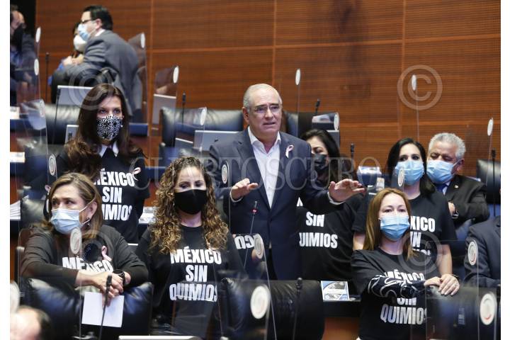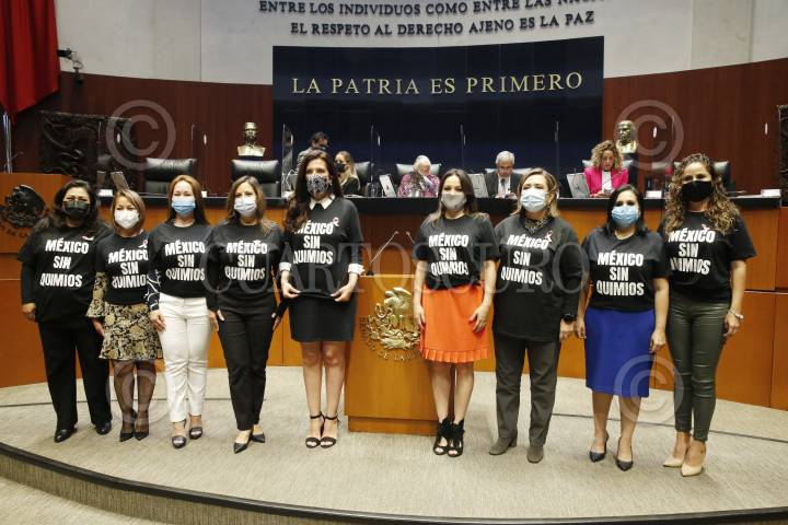Nadia Navarro Acevedo, Minerva Hernández Ramos, Gloria Elizabeth Núñez Sánchez, Gina Andrea Cruz Blackledge, Kenia López Rabadán, Martha Cecilia Márquez Alvarado, Xóchitl Gálvez Ruiz, Mayuli Latifa Martínez Simón, y Estrella Rojas Loreto, se manifestaron con una playera con la leyenda "México sin Quimios", en el Senado de la República.
