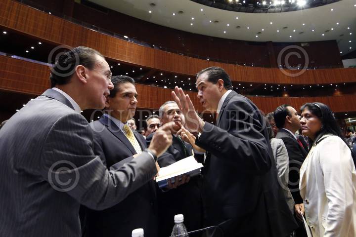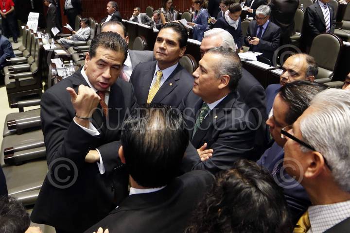 MÉXICO, D.F., 01AGOSTO2014.- Los diputados Héctor Gutiérrez de la Garza, Silvano Aureoles Conejo, Manlio Fabio Beltrones y Ricardo Mejía Bermeja, en la sesión en la cual se discute el quinto dictamen de las leyes secundarias de la Reforma Energética. FOTO: CUARTOSCURO.COM