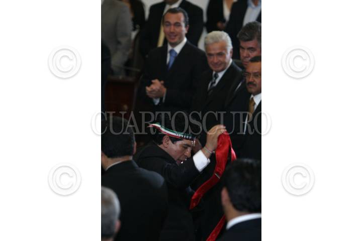 MÉXICO, D.F., 01OCTUBRE2009.- Rafael Acosta "Juanito" se quitó la corbata roja y la tiró al suelo mientras grito "Muera el PT traidor" después de rendir protesta como jefe delegacional en Iztapalapa en la ceremonia de toma de posesión para el periodo 2009-2012 en el recinto Legislativo de Donceles. FOTO: RODOLFO ANGULO/CUARTOSCURO.COM