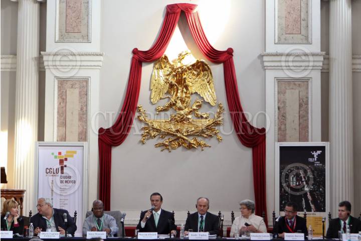 MÉXICO, D.F.,17NOVIEMBRE2010.-Marcelo Ebrard, jefe de gobierno del Distrito Federal, Kadir Topbas de Istambul, Turquia; Elizabeth Gateau de UCLG y Augusto Barrera de Quito, Ecuador durante la inauguración del Bureau Ejecutivo del Congreso Mundial de Líderes Locales y Regionales 2010 (CGLU) el cual se realizo en el Palacio de Mineria. FOTO: RODOLFO ANGULO/CUARTOSCURO.COM