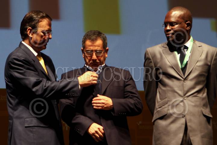 MÉXICO, D.F., 19NOVIEMBRE2010.- Marcelo Ebrard, jefe de gobierno del Distrito Federal; Augusto Barrera, alcalde de Quito, Ecuador y Khalifa Sall, alcalde de Dakar, Senegal durante la plenaria "La Ciudad de 2030" que se realizo como parte de las actividades de la Cumbre Mundial de Líderes Locales y Regionales 2010 que se realizo en el Teatro Metropolitan. FOTO: RODOLFO ANGULO/CUARTOSCURO.COM