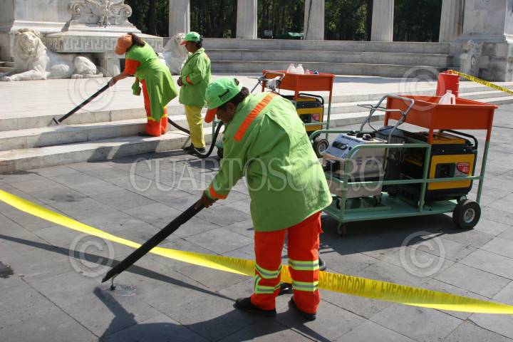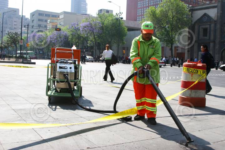 MÉXICO D.F., 25MARZO2009.- Trabajadores de limpieza del Distrito Federal, ocupan las llamadas maquinas quita chicles con las cuales pretenden desprender miles de chicles que los capitalinos arrojan al suelo y se convierten en un foco de infecciona ademas de dañar el pavimento y la imagen urbana FOTO: RICARDO CASTELAN/CUARTOSCURO.COM