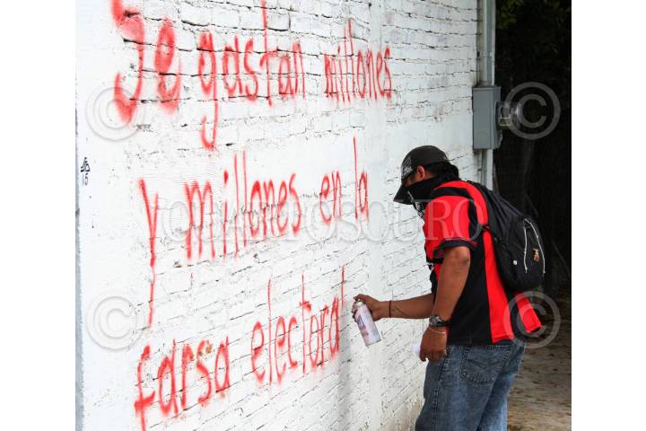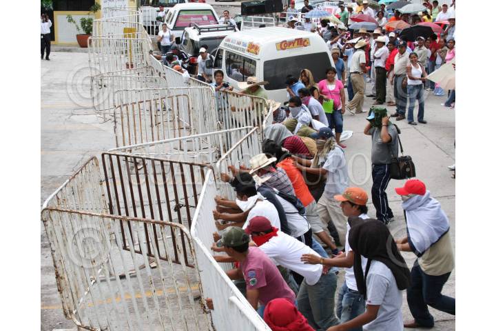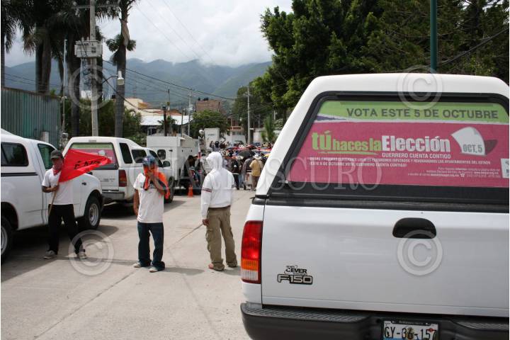 CHILPANCINGO, GUERRERO, 05OCTUBRE2008.- Maestros pertenecientes a la Coordinadora Estatal de los Trabajadores de la Educación en Guerrero (CETEG), egresados de la normal rural de Ayotzinapa y de la normal rural de la montaña, durante la protesta que realizaron afuera de las instalaciones del Instituto Electoral del Estado de Guerrero (IEEG), en la cuál quitaron las vallas de seguridad que resguardaban el organo electoral, realizaron pintas y quemaron una manta ademas de propaganda electoral, esto en protesta contra la Alianza por la Calidad de la Educacion (ACE) en la que hicieron un llamado a la ciudadania a no votar, en el proceso electoral que se desarrolla en el estado, donde se elegiran alcaldes y diputados locales. FOTO: OSCAR ALVARADO/CUARTOSCURO.COM