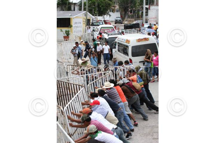CHILPANCINGO., GUERRERO, 05OCTUBRE2008.- Maestros pertenecientes a la Coordinadora Estatal de los Trabajadores de la Educación en Guerrero (CETEG), egresados de la normal rural de Ayotzinapa y de la normal rural de la montaña, durante la protesta que realizaron afuera de las instalaciones del Instituto Electoral del Estado de Guerrero (IEEG), en la cuál quitaron las vallas de seguridad que resguardaban el organo electoral, realizaron pintas y quemaron una manta ademas de propaganda electoral, esto en protesta contra la Alianza por la Calidad de la Educacion (ACE) en la que hicieron un llamado a la ciudadania a no votar, en el proceso electoral que se desarrolla en el estado, donde se elegiran alcaldes y diputados locales. FOTO: OSCAR ALVARADO/CUARTOSCURO.COM
