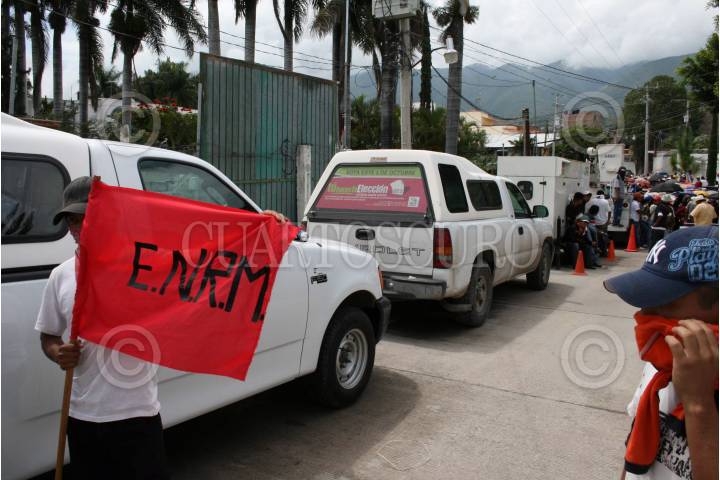 CHILPANCINGO., GUERRERO 05 OCTUBRE2008.-Maestros pertenecientes a la Coordinadora Estatal de los Trabajadores de la Educación en Guerrero (CETEG), egresados de la normal rural de Ayotzinapa y de la normal rural de la montaña, durante la protesta que realizaron afuera de las instalaciones del Instituto Electoral del Estado de Guerrero (IEEG), en la cuál quitaron las vallas de seguridad que resguardaban el organo electoral, realizaron pintas y quemaron una manta ademas de propaganda electoral, esto en protesta contra la Alianza por la Calidad de la Educacion (ACE) en la que hicieron un llamado a la ciudadania a no votar, en el proceso electoral que se desarrolla en el estado, donde se elegiran alcaldes y diputados locales. FOTO: OSCAR ALVARADO/CUARTOSCURO.COM