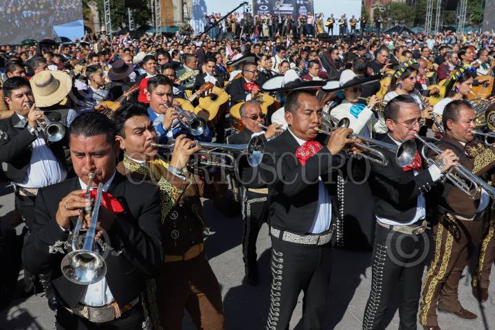 CIUDAD DE MÉXICO, 10NOVIEMBRE2024.- Miles de mariachis se reunieron en el Zócalo para romper el récord Guinness por el mayor concierto de mariachis. FOTO: DANIEL AUGUSTO/ CUARTOSCURO.COM