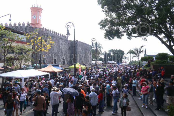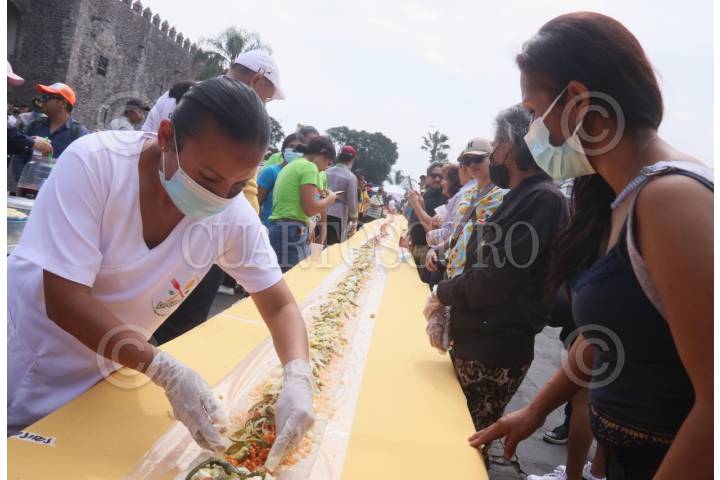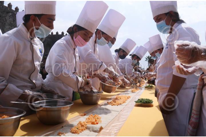 CUERNAVACA, MORELOS, 28ENERO2024.- El ayuntamiento de la capital convoco a escuelas de gastronomía, restauranteros y empresarios de la tortilla para imponer el récord mundial del taco acorazado más largo. Decenas de personas se reunieron en la explanada del Palacio de Cortes para participar en la elaboración del taco que llevo una base de arroz y guisados diversos, el taco alcanzo una longitud de 78 metros, superando la anterior marca de 70 metros que impuso esta ciudad el año pasado. FOTO: MARGARITO PÉREZ RETANA/CUARTOSCURO.COM