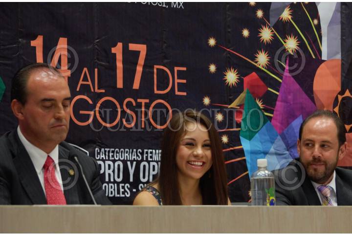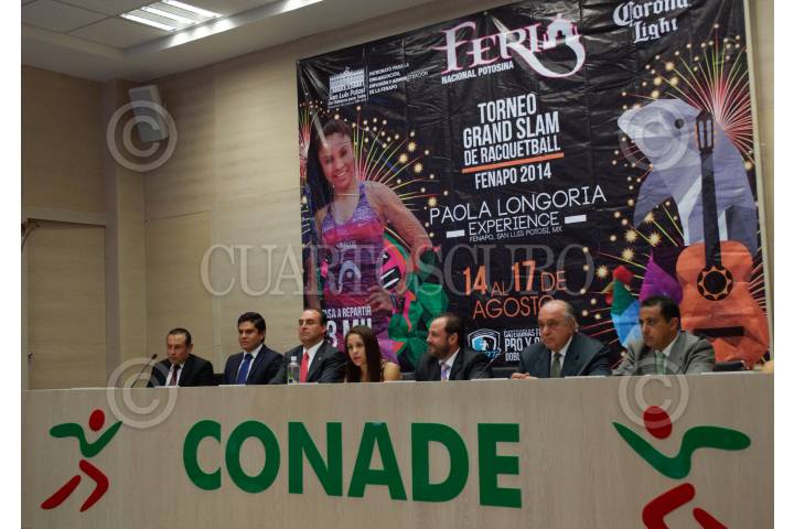 MÉXICO, D.F., 25JULIO2014.- La racquetbolista y campeona internacional de ese deporte, Paola Longoria, presentó en el marco de su gira Paola Longoria Experience, el Torneo Gran Slam de Racquetbol FENAPO 2014, que acontecerá del próximo 14 al 17 de agosto en la Feria Nacional Potosina (FENAPO). El panel fue presidido por Othon Díaz, subdirector general de la CONADE; Juan Fernando Sarquis, presidente del patronato de la FENAPO y Fernando Pérez, presidente del congreso del estado de San Luis Potosí. FOTO: MARÍA JOSÉ MARTÍNEZ /CUARTOSCURO.COM