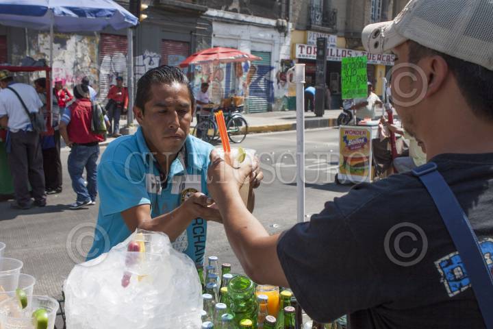 MÉXICO, D.F, 04ABRIL2013.- Un vendedor ofrece tehuacanes y sangrias preparados con mucho hielo, sal y limón, por aquello de la deshidratación ante los fuertes calores que se han vivido en la capital. FOTO: MOISÉS PABLO /CUARTOSCURO.COM
