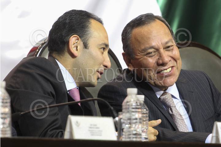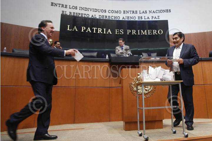 MÉXICO, D.F., 27NOVIEMBRE2014.- Emilio Gamboa, Coordinador de los senadores del PRI en el senado junto a Miguel Barbosa Huerta, Presidente del Senado, durante la Votación de los integrantes del Consejo Ciudadano del Sistema de Radiodifusión. FOTO: CUARTOSCURO.COM