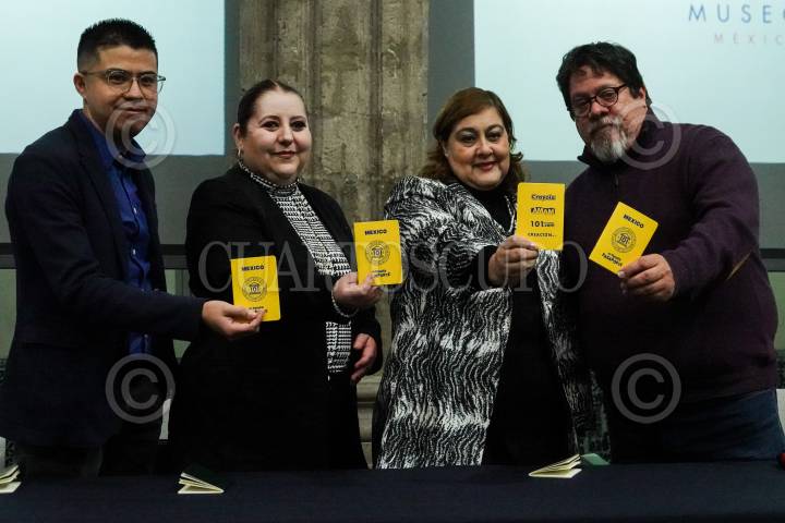 Rafael Chontal; Karla González; Rosa Martha Hernández y Manuel Ríos durante conferencia de prensa para presentar “Mi Primer Pasaporte” como parte del proyecto 101 Museos en el Museo Interactivo de Economía (MIDE).