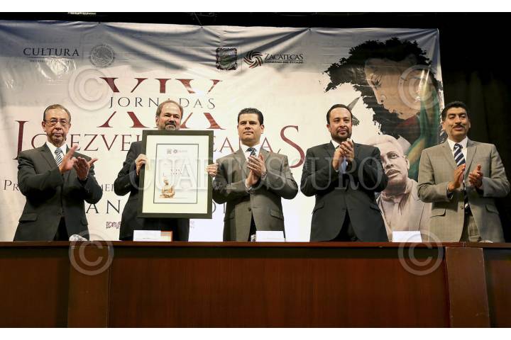 ZACATECAS, ZACATECAS, 17JUNIO2016.- Miguel Alonso Reyes, gobernador del estado, entregó el Premio Iberoamericano "Ramón López Velarde" al escritor Juan Villoro, por su intensa labor de difusión de la vida y obra del poeta jerezano. FOTO: CUARTOSCURO.COM