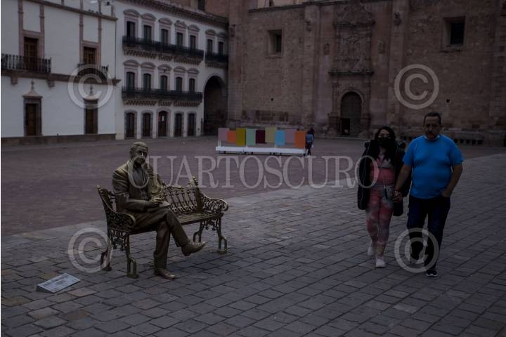 Escultura del poeta zacatecano Ramón López Velarde, creador de "Suave Patria", en el centro histórico de Zacatecas.