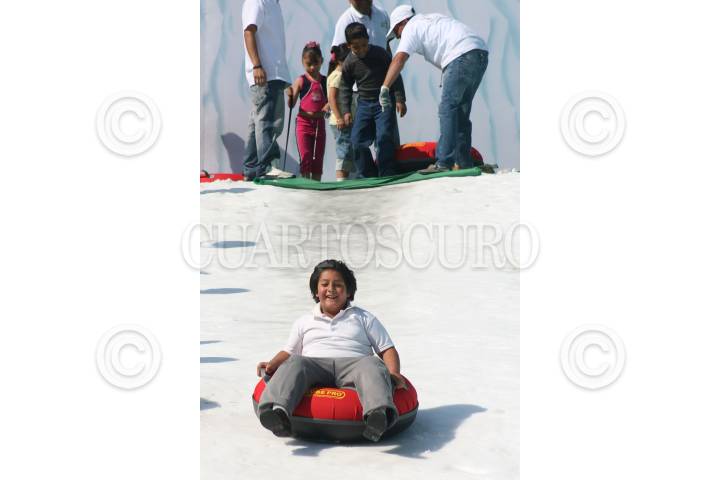 MÉXICO, D.F., 03DICIEMBRE2008.- Un niño se desliza sobre una de las rampas de hielo que están ubicadas en el Zocalo Capitalino. FOTO: RICARDO CASTELAN/CUARTOSCURO.COM