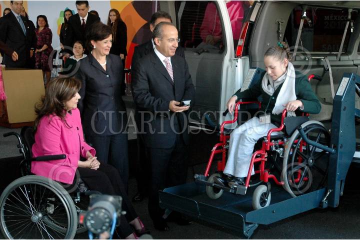 MÉXICO, D.F., 03DICIEMBRE2009.- El presidente Felipe Calderón acompañado de su esposa Margarita Zavala y la diputada federal Claudia Edith Anaya durante la activación del mecanismo de la rampa instalada en una de las camionetas al termino del evento de entrega de vehículos a sistemas estatales DIF que se realizo en el estacionamiento del Campo Militar Marte. FOTO: RODOLFO ANGULO/CUARTOSCURO.COM
