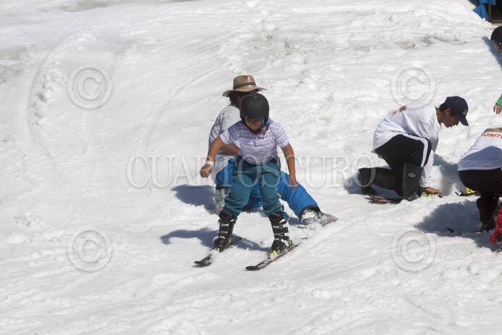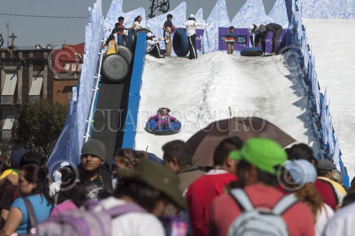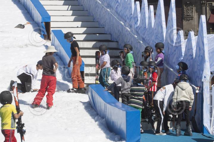 MÉXICO, D.F., 28DICIMBRE2012.- Decenas de niños disfrutan de las atracciones navideñas en el zócalo, como la rampa de hielo en donde pueden practicar o aprender, por unos minutos, a esquiar en nieve, aunque es larga la espera bien vale la pena, a decir de los rostros de los pequeños que se divierten de lo lindo. FOTO: MOISÉS PABLO /CUARTOSCURO.COM
