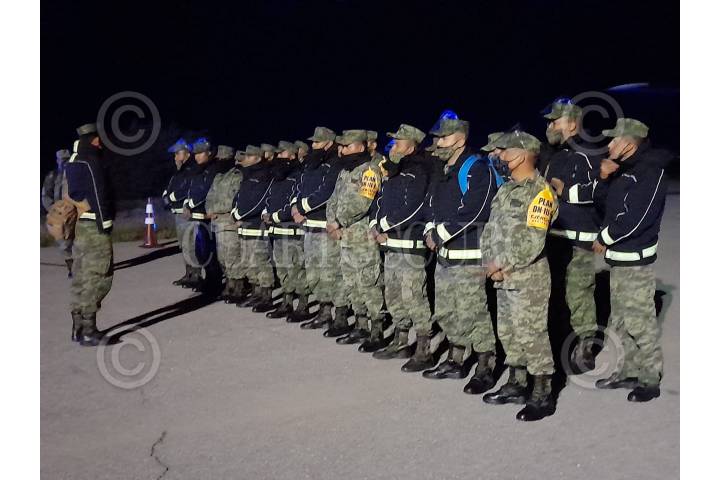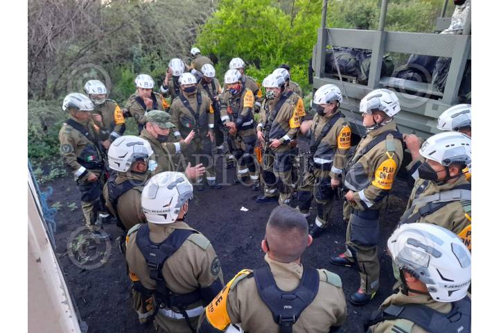Elementos de la Guardia Nacional, la Secretaría de la Defensa Nacional (Sedena), participan en las labores de rescate de los trabajadores que se encuentran atrapados tras el colapso en una mina de la comunidad de Rancherías.