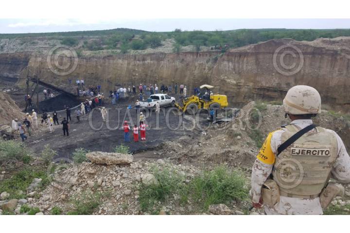 Familiares y compañeros de los mineros que quedaron atrapados en la mina extractora de carbón en el Poblado de Rancherías, continúan al exterior del lugar del accidente en espera de respuestas mientras continúan las labores de rescate; además elementos de la Guardia Nacional, resguardan el área aledaña.