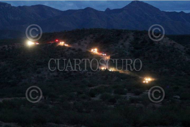 BAVISPE, SONORA, 06NOVIEMBRE2019.- Una caravana de aproximadamente 70 camionetas arribaron al rancho La Morita propiedad de la familia LeBarón para participar el día de mañana en el funeral de las 9 personas que fueron asesinadas en un camino de terraceria por un comando armado, 6 de las victimas menores de edad, el convoy fue custodiado por elementos de la Guardia Nacional. FOTO: NACHO RUIZ /CUARTOSCURO.COM