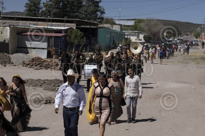 Familiares e invitados caminan por la calle Hidalgo, de la iglesia a la casa habilitada como salón de fiestas, para continuar con la comida.