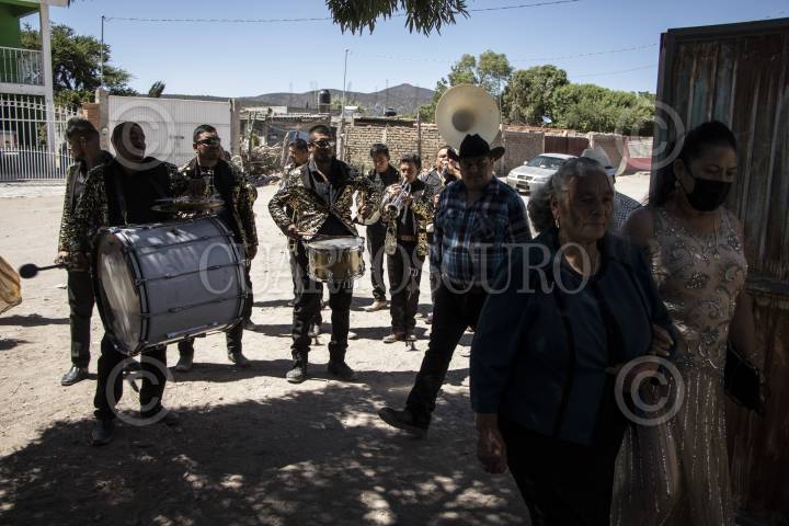 El tamborazo Diamante, espera en el atrio de la iglesia a que los novios salgan para iniciar con la música de festejo.