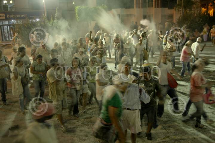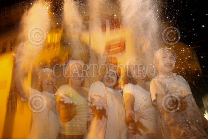 TENOSIQUE, TABASCO, 20ENERO2011.- La fiesta de la carne da inició con la festividad más importante en Tabasco con el Baile de la Harina. Este populosa actividad en la que festejan a su santo patrono San Sebastian, data al menos desde hace cien años, donde el pueblo completo se enfrasca arrojando huevos podridos y harina entre ellos, para alejar la malas vibras, representado una batalla entre el Bien y Mal. El encuentro se desarrollo en el parque central con la participación de al menos cinco mil lugareños que protagonizaron el carnaval "Mas Raro del Mundo". FOTO: MARCO POLO GUZMÁN HERNÁNDEZ/CUARTOSCURO.COM