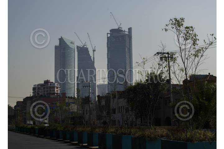 MÉXICO, D.F., 18 ABRIL2015.- La semana pasada permaneció desde el 10 de abril la fase de contingencia ambiental debido a los altos índices de ozono en la capital del país. Una ligera nubosidad todavía se observa en el horizonte enmarcado por tres de los edificios más altos de la ciudad. FOTO: MARÍA JOSÉ MARTÍNEZ /CUARTOSCURO.COM