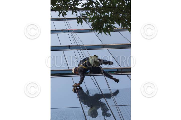 MÉXICO, D.F., 20ABRIL2015.- Un limpia vidrios trabaja en un rascacielos sobre Paseo de la Reforma. FOTO: ISAAC ESQUIVEL /CUARTOSCURO.COM