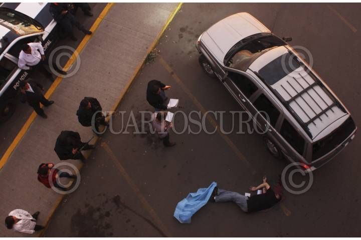 CULIACAN, SINALOA, 21DICIEMBRE2011.- Francisco Javier Félix Romero de 34 años fue asesinado a balazos mientras se encontraba parado, a un lado de su camioneta, en el estacionamiento del mercado Humaya. Criminalistas que acudieron al sitio recolectaron ocho casquillos de calibre 45 como evidencia. Una vez que el representante del Ministerio Público especializado en homicidios dolosos diera fe de los hechos, el cuerpo fue trasladado al Servicio Médico Forense. FOTO: RASHIDE FRIAS/CUARTOSCURO.COM