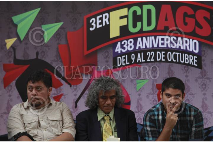 AGUASCALIENTES, AGUASCALIENTES, 19OCTUBRE2013.- Juan Carlos Reyes, José de Jesús Ávila Ramírez y Enrique Rashide Serrato Frías, ganadores del tercer, primer y segundo lugar, respectivamente, del concurso "Fiestas y festejos populares en México", convocado por el Instituto Municipal Aguascalentense para la Cultura y Cuartoscuro, ayer durante la ceremonia de premiación e inauguración de la exposición en el Museo Regional de Historia de Aguascalientes. FOTO: RITA SANTIAGO /CUARTOSCURO.COM