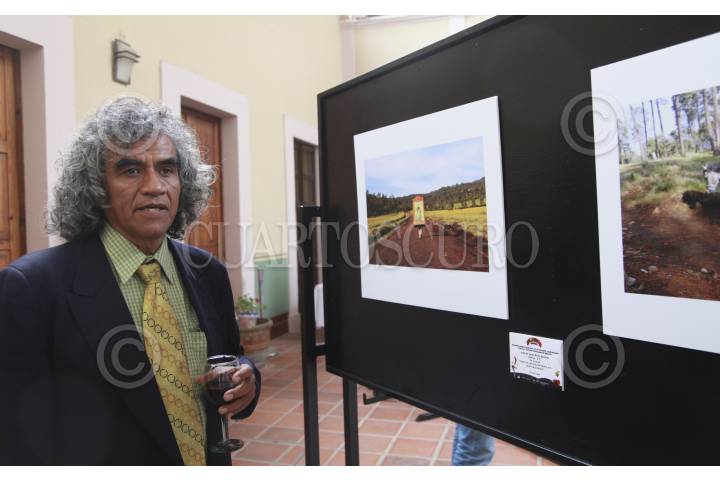 AGUASCALIENTES, AGUASCALIENTES, 19OCTUBRE2013.- José de Jesús Ávila Ramírez, ganador primer lugar del Concurso "Fiestas y festejos populares en México", convocado por el Instituto Municipal Aguascalentense para la Cultura y Cuartoscuro junto a sus imágenes durante la inauguración de la exposición ayer en el Museo Regional de Historia de Aguascalientes. FOTO: RITA SANTIAGO /CUARTOSCURO.COM