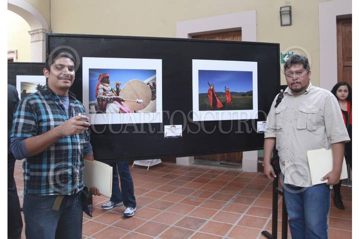 AGUASCALIENTES, AGUASCALIENTES, 19OCTUBRE2013.- Enrique Rashide Serrato Frías y Juan Carlos Reyes, ganadores del segundo y tercer lugar, respectivamente, del Concurso "Fiestas y festejos populares en México", convocado por el Instituto Municipal Aguascalentense para la Cultura y Cuartoscuro durante la inauguración ayer en el Museo Regional de Historia de Aguascalientes. FOTO: RITA SANTIAGO /CUARTOSCURO.COM