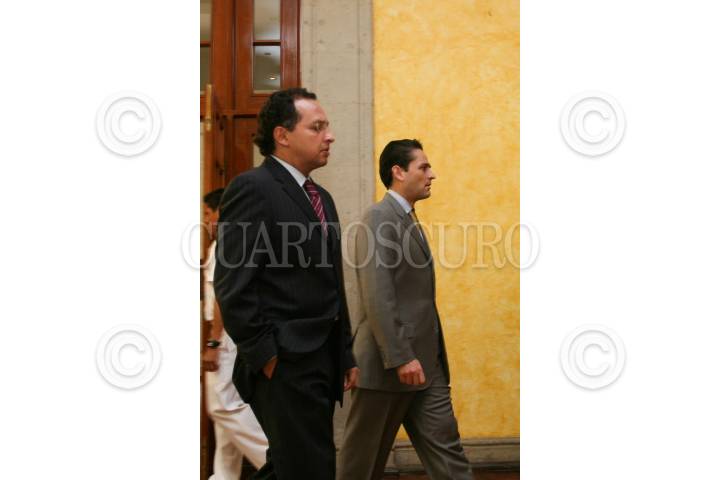 MÉXICO D.F., 16JULIO2008.-El presidente, Felipe Calderón Hinojosa, en un breve mensaje acepto la desición del jefe de gobierno capitalino para la designación de Manuel Mondragón y Kalb como Secretario de Seguridad Pública y ratificó el nombramiento de Miguel Ángel Mancera como titular de la Procuraduría General de Justicia del Distrito Federal.En la imagen, Maximiliano Cortazar, Coordinador de Comunicación de la Presidencia de la República Presidencia y Juan Camilo Mouriño titular de la Secretaria de Gobernación. FOTO: GUILLERMO PEREA/CUARTOSCURO.COM