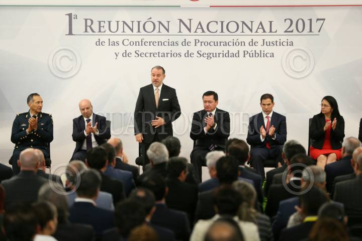 CIUDAD DE MÉXICO, 28MARZO2017.- Renato Sales, Comisionado Nacional de Seguridad; Raúl Cervántes, Procurador General de la República; Miguel Ángel Osorio Chong, secretario de Gobernación, y Pablo escudero, presidente de la mesa directiva del Senado de la República, durante la 1a Reunión Nacional 2017 de las Conferencias de Procuración de Justicia y de Secretarios de Seguridad Pública. FOTO: PGR /CUARTOSCURO.COM