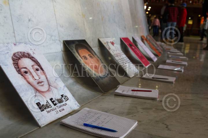 CIUDAD DE MÉXICO, 21OCTUBRE2018.- En la entrada del Museo Nacional de Antropología estudiantes de la Escuela Nacional de Antropología e Historia (ENAH) colocaron un altar para recordar a los 43 jóvenes desaparecidos de la escuela rural "Raúl Isidro Burgos", con retratos de los jóvenes originarios de Ayotzinapa, Guerrero, se invita a la gente a que escriba una frase de aliento para sus familias en libretas colocadas exprofeso para ello. FOTO: MOISÉS PABLO /CUARTOSCURO.COM