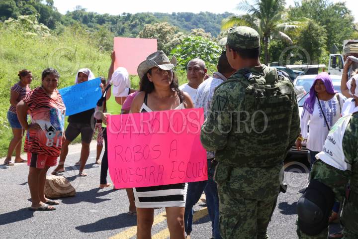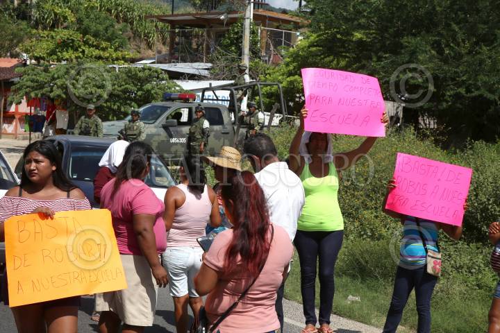 ACAPULCO, GUERRERO, 30OCTUBRE2019.- Maestros y padres de familia de la secundaria Raúl Isidro Burgos de la comunidad de Los Órganos ubicado en la zona rural de Acapulco, bloquearon la carretera federal México–Acapulco, para pedir seguridad en la escuela ya que denunciaron que en lo que va del año han sufrido mas de cinco robos en la escuela, por lo que exigen seguridad de soldados y la construcción de una barda perimetral que proteja la escuela. FOTO: CARLOS ALBERTO CARBAJAL /CUARTOSCURO.COM