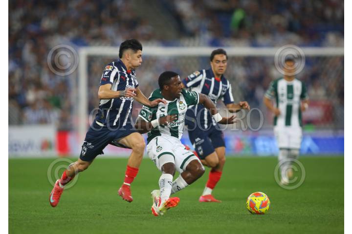 GUADALUPE, NUEVO LEÓN, 02MARZO2025.- RIicardo Chávez de los Rayados del Monterrey, se disputa el balón con Cristian Dájome de Santos, en el estadio BBVA, partido correspondiente a la jornada 10 de la Clausura 2025 de la LIga Mx. Marcador Final: Monterrey: 4 - Santos: 2. FOTO: GABRIELA PÉREZ MONTIEL / CUARTOSCURO.COM