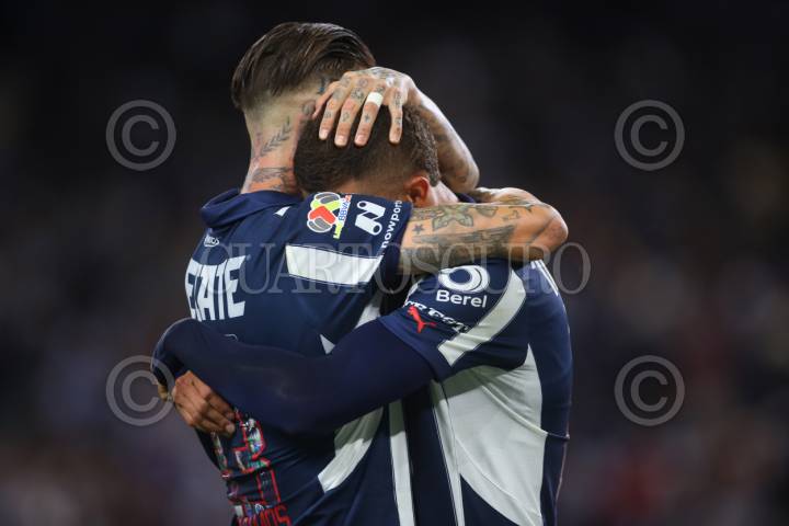 GUADALUPE, NUEVO LEÓN, 05ABRIL2025.- Roberto de la Rosa y Sergio Ramos de los Rayados del Monterrey, festejan el gol ante las Chivas del Guadalajara, en el estadio BBVA, partido correspondiente a la jornada 14 de la Clausura 2025 de la Liga Mx. Marcador Final: Monterrey: 3 - Guadalajara: 1 FOTO: GABRIELA PÉREZ MONTIEL / CUARTOSCURO.COM