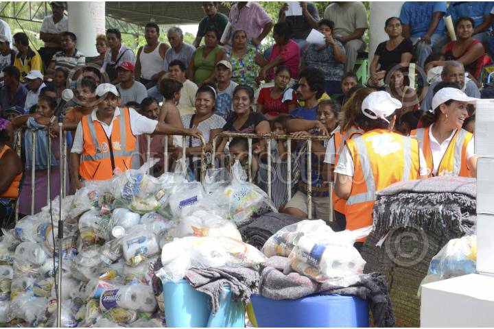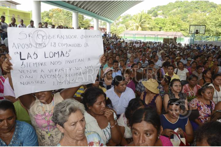 COYUCA DE BENÍTEZ, GUERRERO, 30OCTUBRE2013.- Después del paso de tormenta Manuel y el huracán Raymond, el secretario de Desarrollo Rural de Guerrero, Humberto Zapata Añorve, asistió a municipio de Coyuca de Benítez para otorgar a los damnificados despensas, colchonetas, sarapes, líquidos, bombas aspersoras, semillas mejoradas y recursos para los campesinos que perdieron sus cosechas de plátano, café, mango y coco. Durante el evento, hubo protestas con pancartas de damnificados de Las Lomas que no han sido considerados en el padrón de beneficiarios y no recibieron la tarjeta para la adquisición de enseres y el recurso de empleo temporal. FOTO: BERNANDINO HERNÁNDEZ /CUARTOSCURO.COM