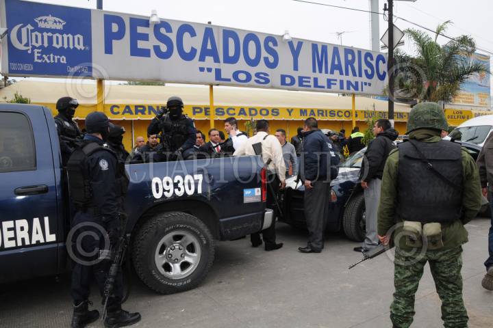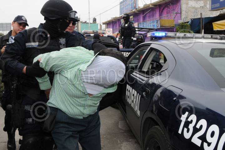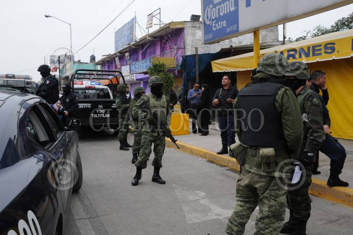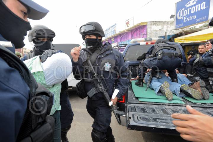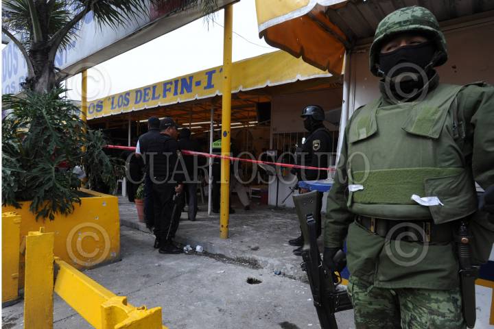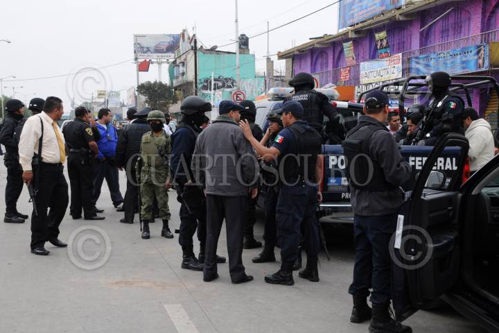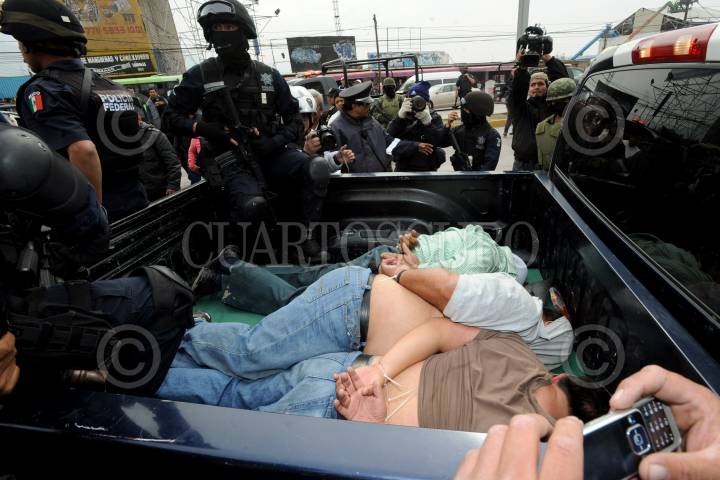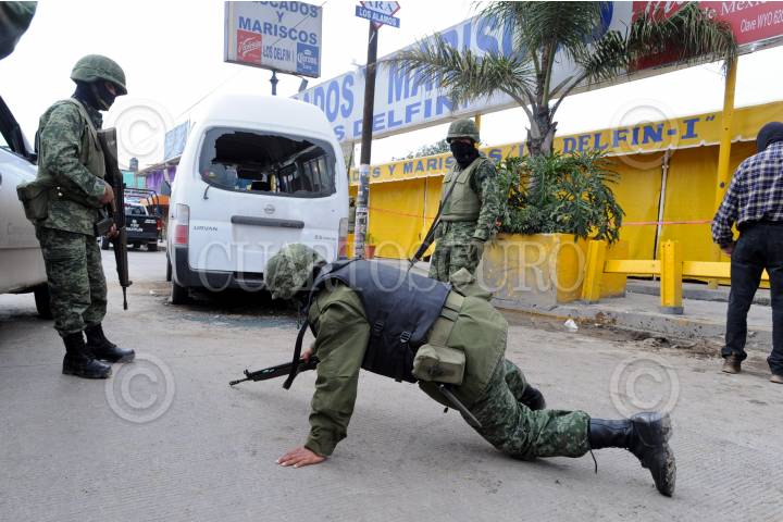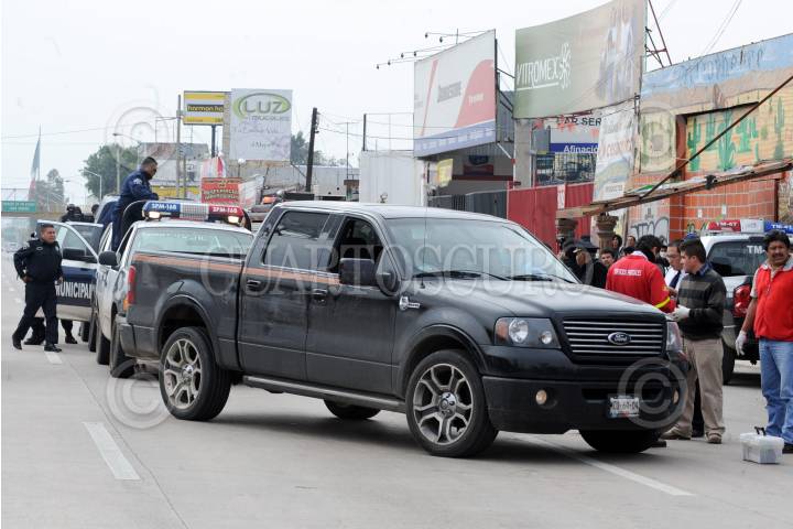 COACALCO, ESTADO DE MÉXICO 11ENERO2009.- Un oficial de la policía Municipal de Coacalco, perdio la vida durante un enfrentamiento entre presuntos secuestradores y policias. Los cuales al verse rodeados les arrojaron granadas, dejando a un elemento sin vida los hechos ocurrieron frente al restaurante de Mariscos con razón social “Los Delfín I” ubicado en avenida José López Portillo a la altura del Eje 8 en Coacalco. Escapando un delincuente en una de las unidades de los policías Municipales el cual fue alcanzado calles adelante abatiéndolo a tiros en la unidad. Al lugar arribaron elementos del Ejercito Mexicano y para resguardar el lugar en donde fueron detenidos tres presuntos secuestradores y dos camionetas una tipo Urban y una Ford Lobo de reciente modelo. FOTO: LUIS CARBAYO/CUARTOSCURO.COM