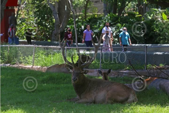 Un Venado del Zoológico de Guadalajara mira hacia la cámara, mientras al fondo se aprecian algunos visitantes al mismo, esto después de cuatro meses de permanecer cerrado a causa de la pandemia sanitaria del Coronavirus Covid 19.