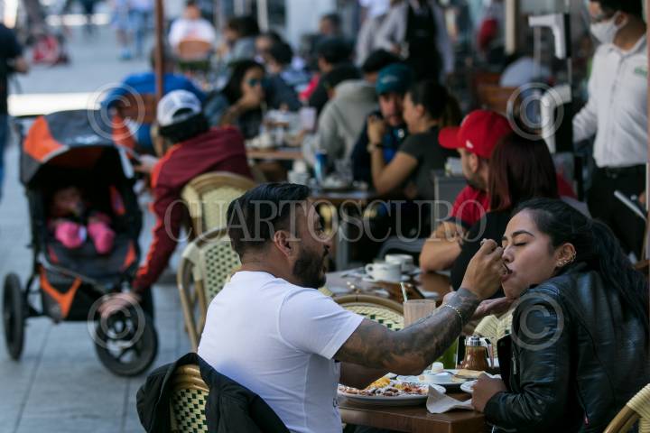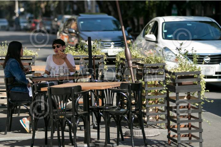 Dos mujeres come sobre la vialidad en la calle de Puebla en la colonia Condesa.