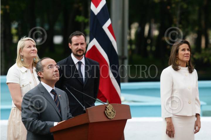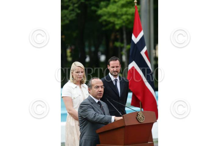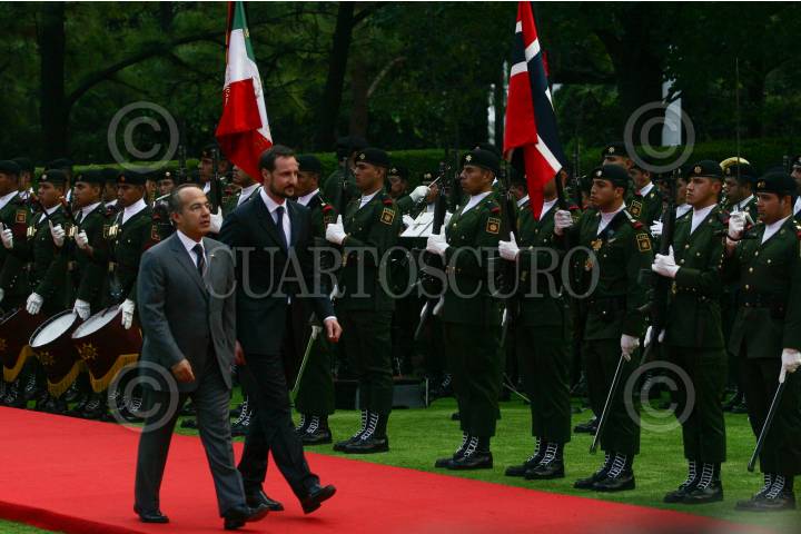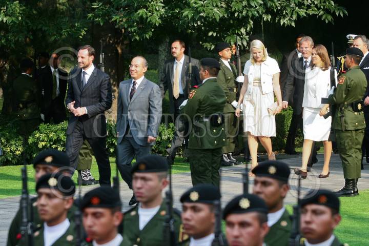 MÉXICO, D.F., 16MARZO2009.- Los príncipes de Noruega, Haakon y Mette Marit, fueron recibidos por Felipe Calderón Hinojosa, presidente de México, durante una ceremonia en la residencia oficial de Los Pinos. FOTO: ISAAC ESQUIVEL/CUARTOSCURO.COM