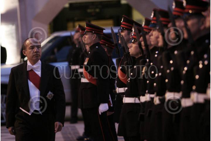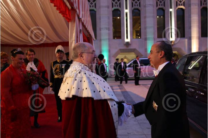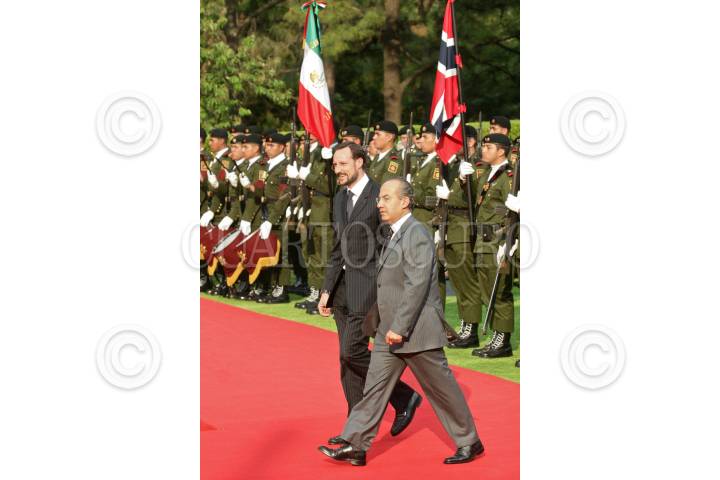 MÉXICO, D.F., 16MARZO2009.- El príncipe Haakon de Noruega y Felipe Calderon Hinojosa, presidente de México, durante la ceremonia de bienvenida ofrecida a los príncipes en Los Pinos. FOTO: ISAAC ESQUIVEL/CUARTOSCURO.COM