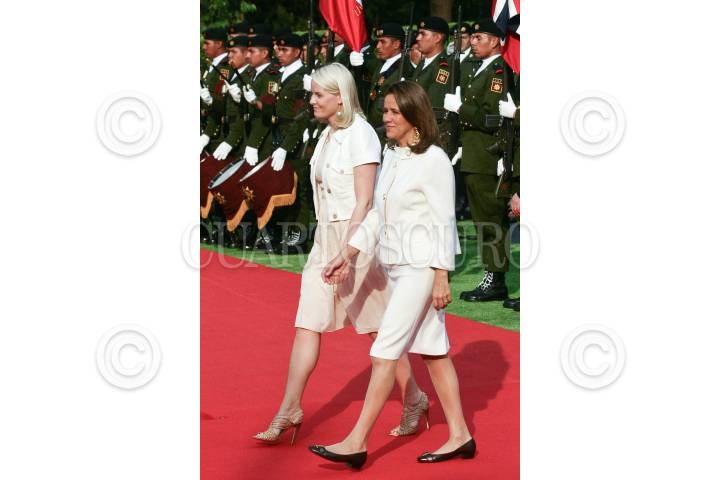 MÉXICO, D.F., 16MARZO2009.- La princesa Mette Marit de Noruega y Margarita Zavala, esposa de Felipe Calderón, presidente de México, durante la ceremonia de bienvenida ofrecida a los príncipes en Los Pinos. FOTO: ISAAC ESQUIVEL/CUARTOSCURO.COM