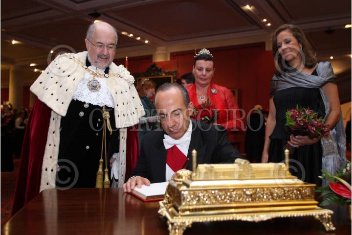 LONDRES, REINO UNIDO, 31MARZO2009.- El presidente de México, Felipe Calderón Hinojosa firma el libro de visitantes distinguidos durante la cena ofrecida en su honor por Lord Mayor, Ian Luder, evento que se desarrolló en Guildhall. FOTO: ALFREDO GUERRERO/CUARTOSCURO.COM
